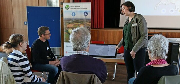 Bei der Veranstaltung wurde zunächst allen Teilnehmenden das Planspiel vorgestellt, um anschließend in Kleingruppen mit dem Dialogtool eine Energieversorgung aus erneuerbaren Energien für die Kommune zu simulieren. Dabei wurden auf potenziell geeigneten Flächen Windenergie- und Photovoltaikanlagen platziert. Somit entstand eine solide Diskussionsgrundlage für Fragen wie „Welche Energieträger können wo genutzt werden?“ oder „Welche Flächen sind für eine mensch- und naturverträgliche Stromerzeugung geeignet?“.