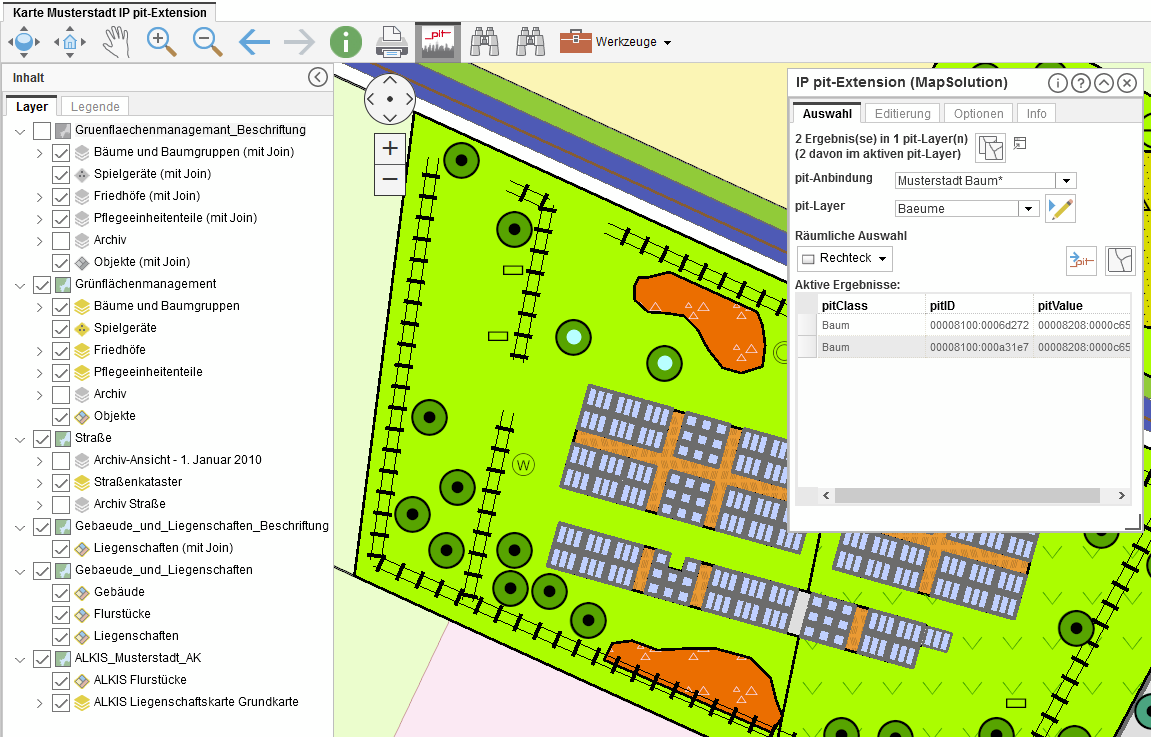 "IP pit-Extension" dient als intelligentes Verbindungselement zwischen GIS-Anwendung und Betriebssteuerungssoftware, konkret als Verknüpfung und Visualisierung von Daten aus pit-Kommunal.